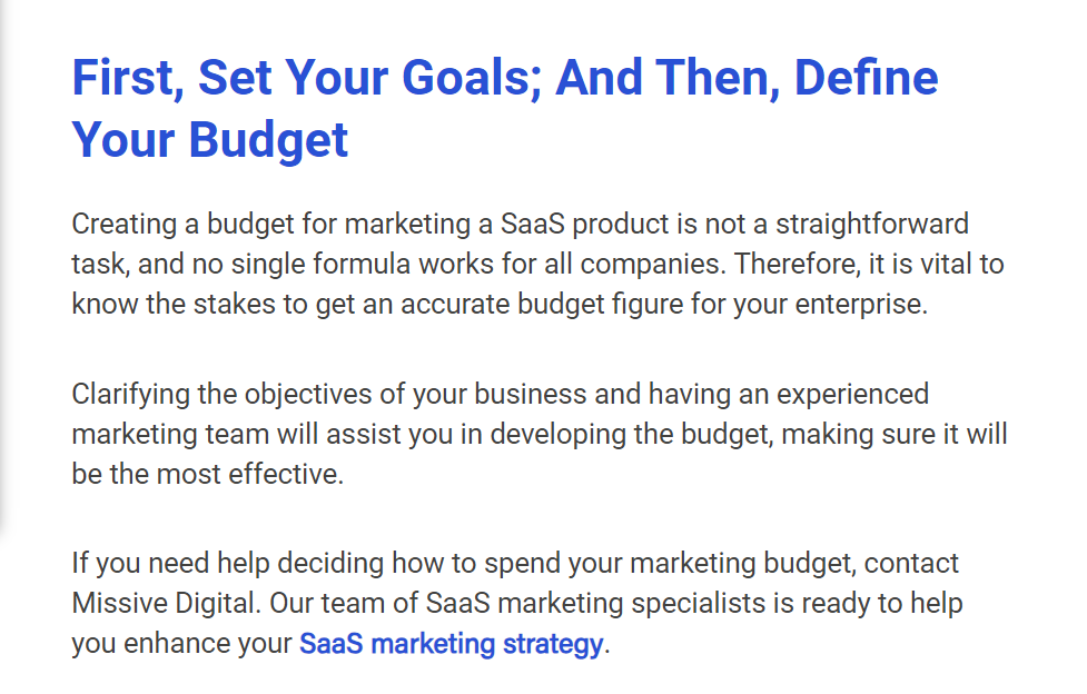 Our blog that talks about SaaS marketing costs, its concluding headline guides users to define their goals to get better clarity about how much they should spend on their marketing.