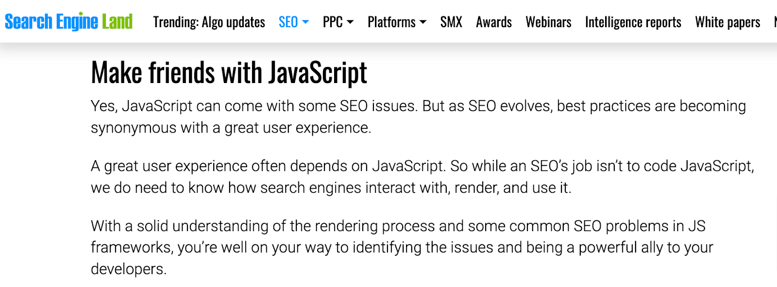 Another brilliant example here is from a blog on A guide to diagnosing common JavaScript SEO issues by Tory Gray, where she asked SEOs to make friends with JavaScript in her conclusive H2 tag.