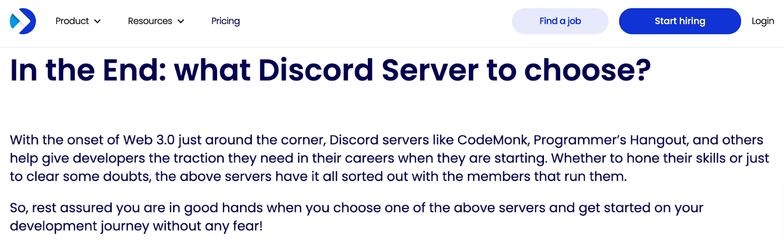 We wrote content on the Top 10 Discord Servers to join as a Developer for Codemonk.ai, one of the top talent platforms for developers, and we wanted to invoke the audience’s thinking process with this conclusion headline, “In the End: what Discord Server to choose?”