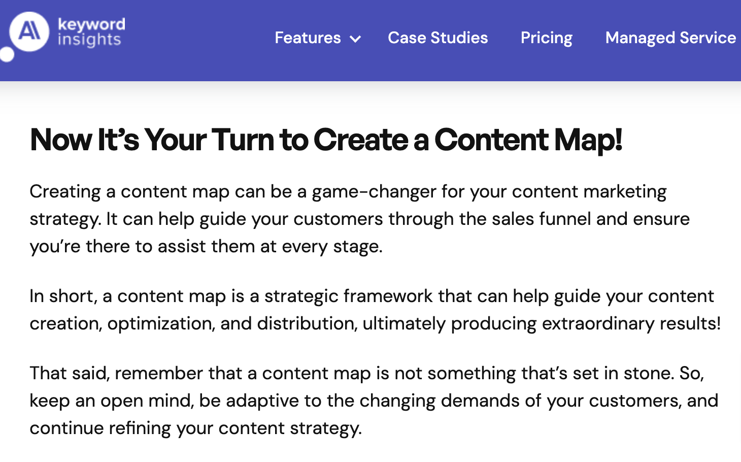 Let’s take a look at one of the blogs from our favourites, Keyword Insights, on content map. Here the concluding H2 says, “Now It’s Your Turn to Create a Content Map!.”