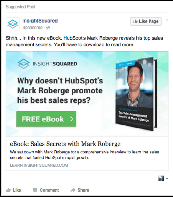 Mark Roberge, one of the biggest names in SaaS sales, is shown as a valuable resource in this eBook. There are several things InsightSquared does well in this ebook promotion, in which the ‘Free eBook’ call-to-action is prominent.