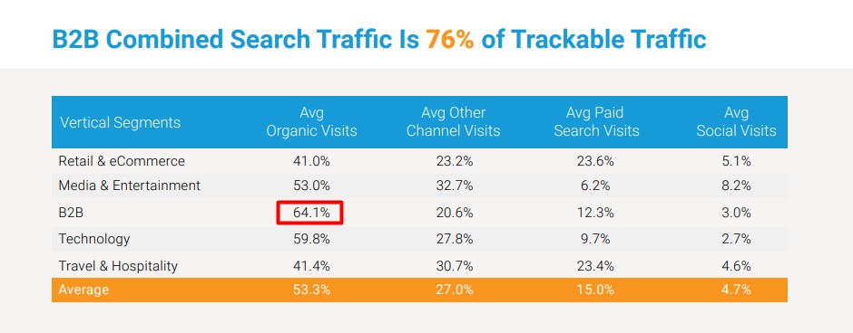 In fact, according to a study by BrightEdge, organic search is the top source of website traffic for B2B companies, with 64% of trackable website traffic coming from organic search. The study also found that B2B companies generate 2X more revenue from organic search than other traffic sources.